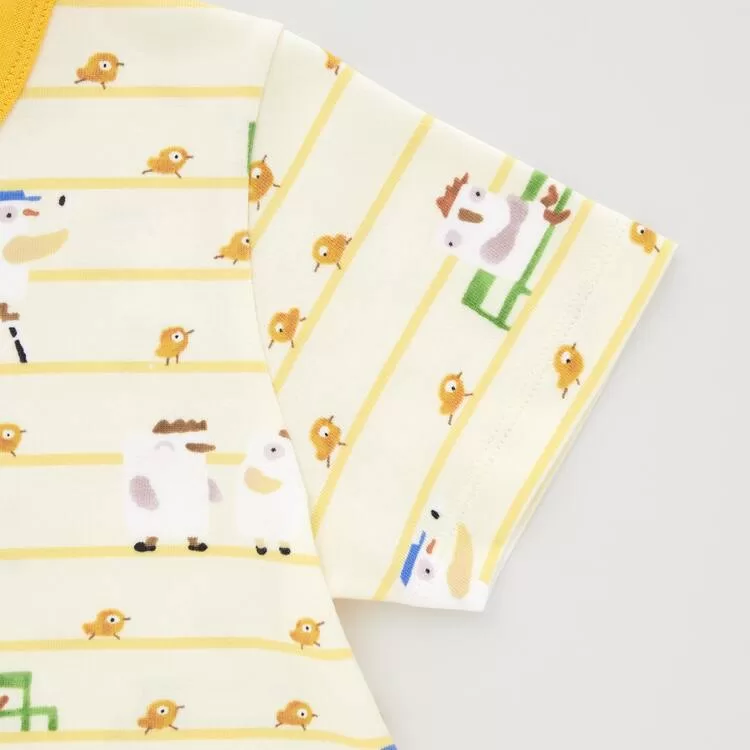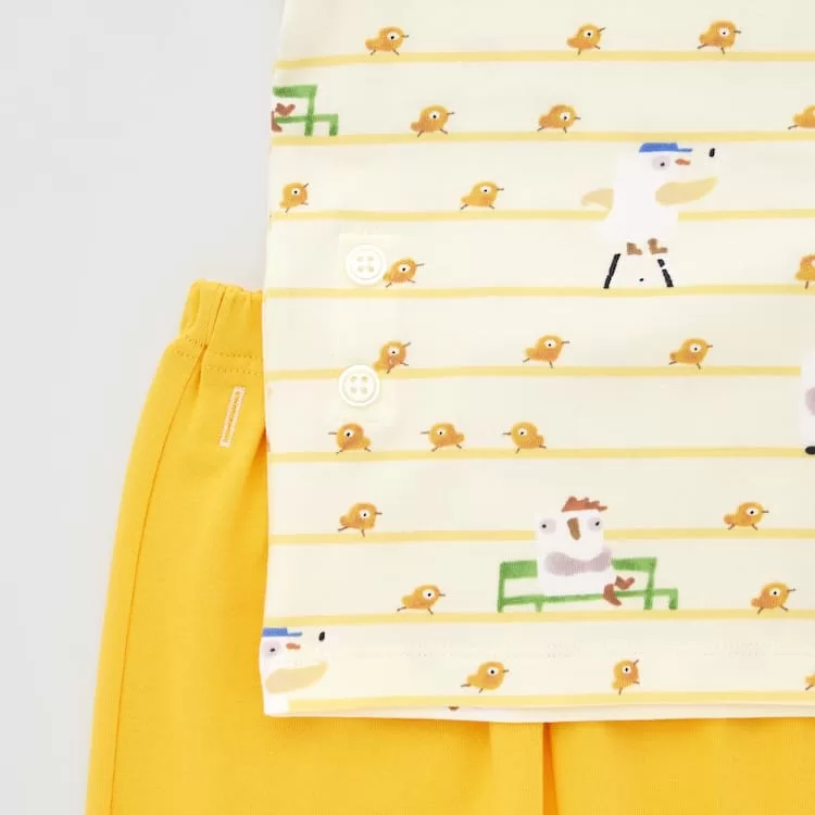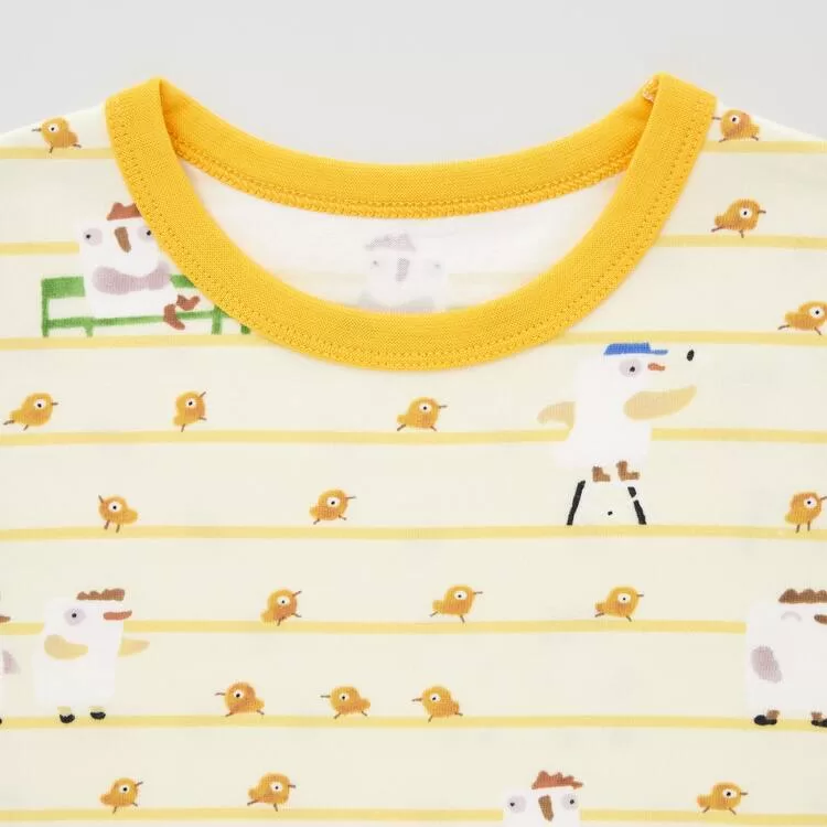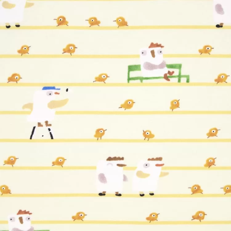 These pajamas feature an all-over print of the chick in Taro Gomi’s popular picture book “Hiyoko Ha Nigemasu” (The Chick Get Away). The picture book’s worldview is depicted in abundance as the chick cheerfully escapes from her home and runs far and wide in the wide world.