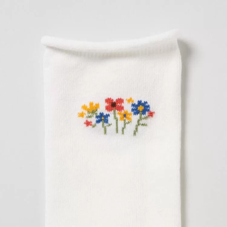 · The floral print socks have been rolled for unrestrictive comfort.