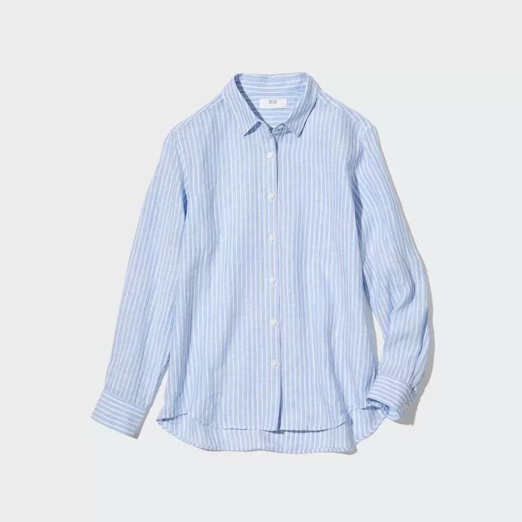 Uniqlo 100% Premium Linen Striped Long Sleeved Women’s Shirts Light Blue