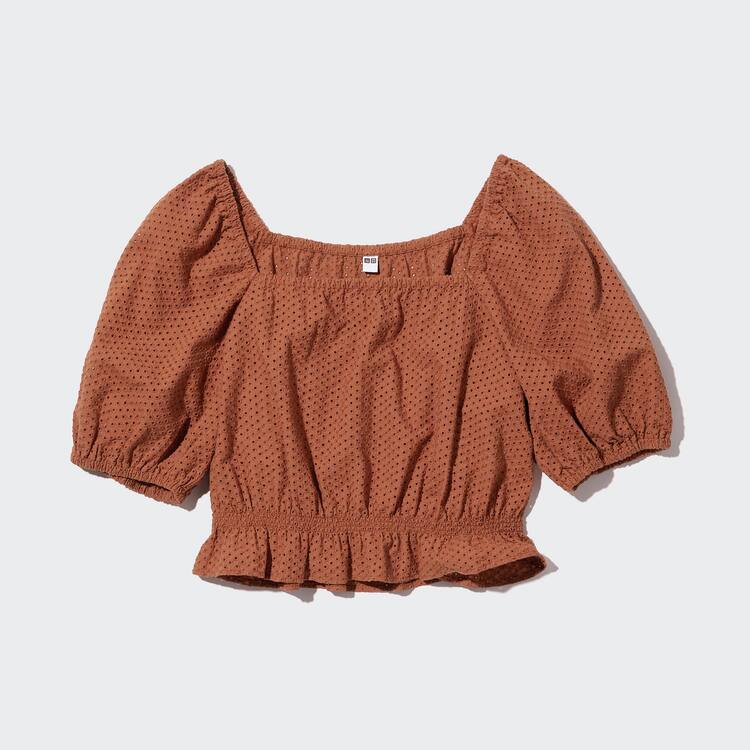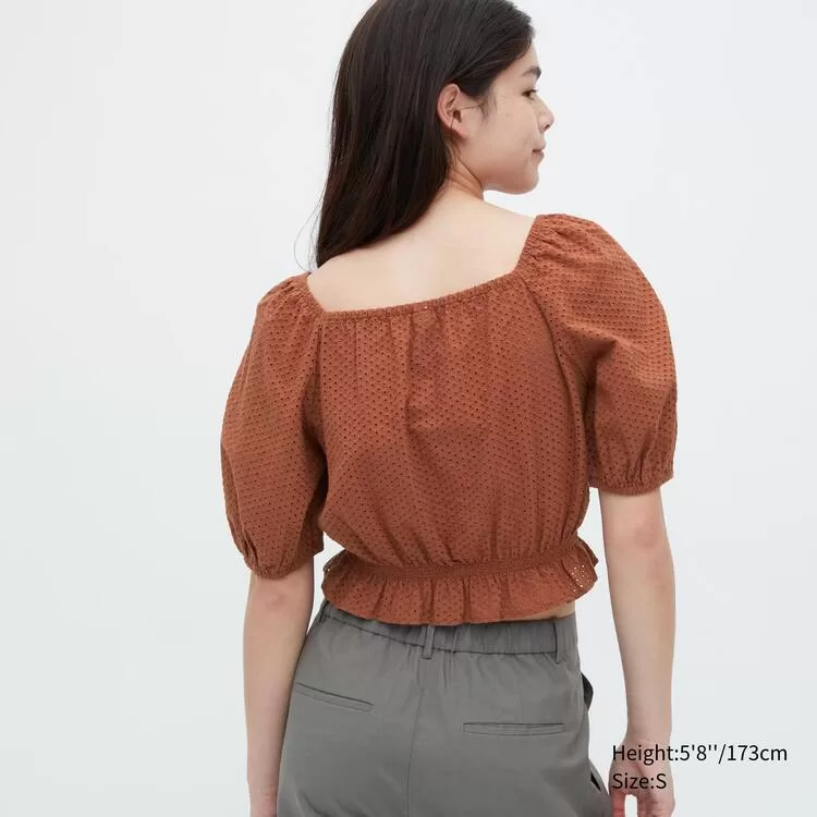 Home Uniqlo Women Uniqlo Cotton Embroidered Square Neck Short Sleeved Blouses Women Brown
