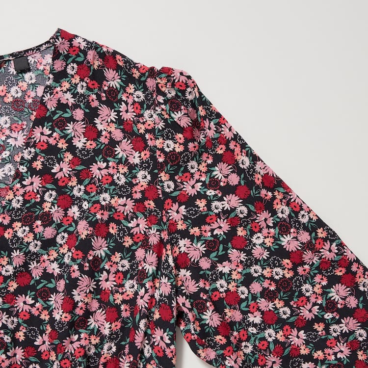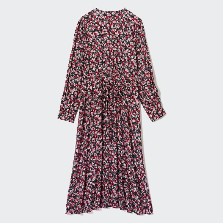 – Fit-and-flare cut, accentuated by gathers at the waist.
