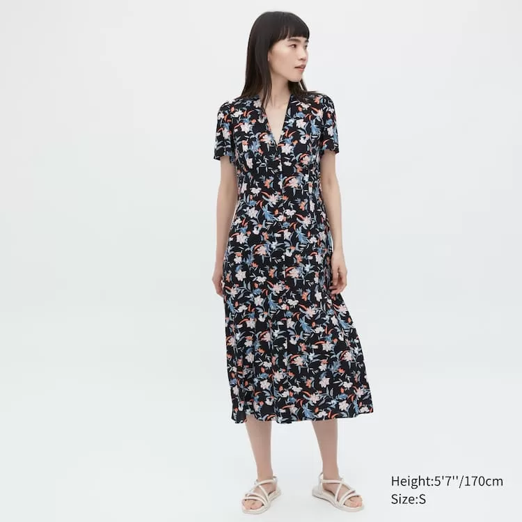 Home Uniqlo Women Uniqlo Printed V Neck Short Sleeved Flared Dress Women Black